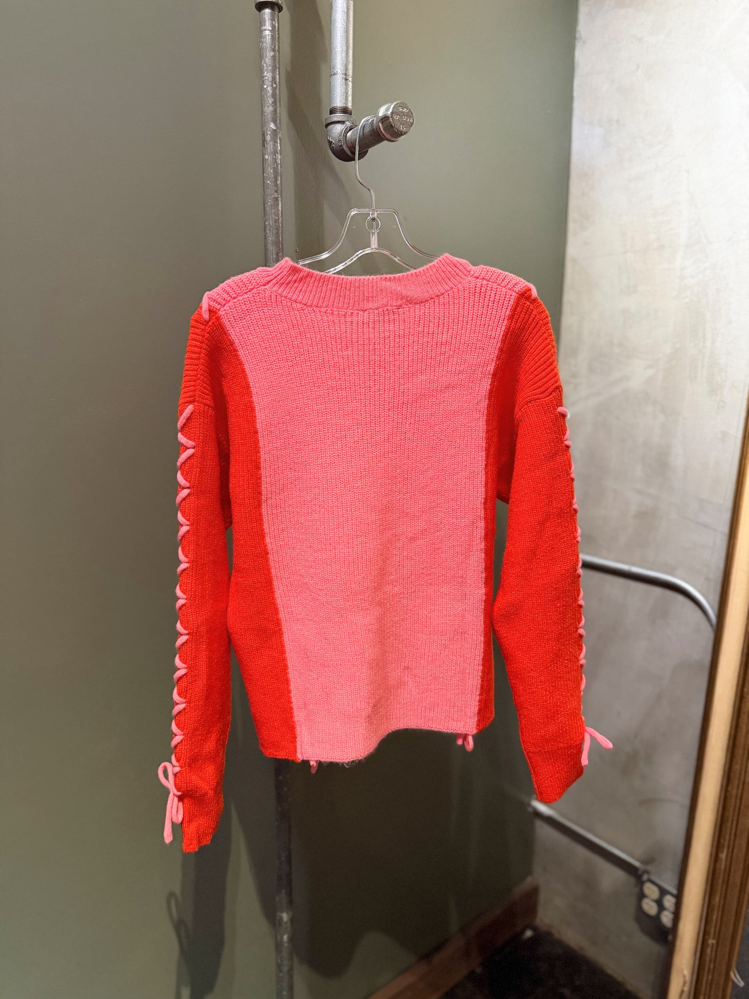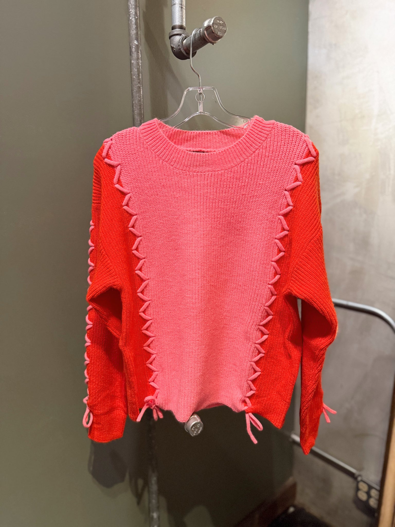 A statement knit you’ll fall in love with instantly. This eye-catching sweater features a soft pink-to-red ombré design with feminine lace-up detailing along the front and sleeves for the perfect touch of texture. Finished with a classic crew neckline and cozy knit feel, perfect for dressing up with denim or keeping it casual for everyday wear.
