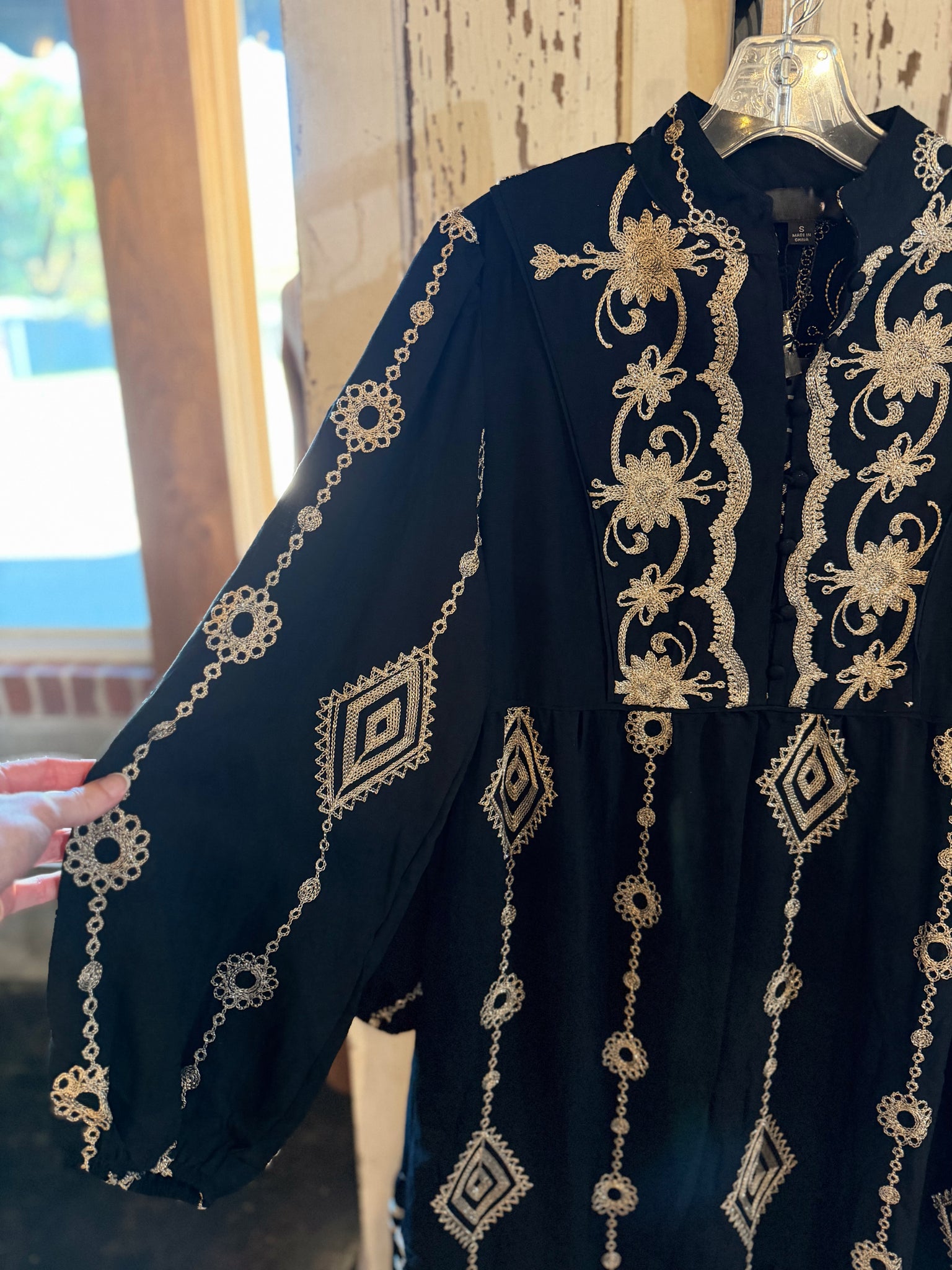 Buttoned v-neck midi dress with metallic embroidery