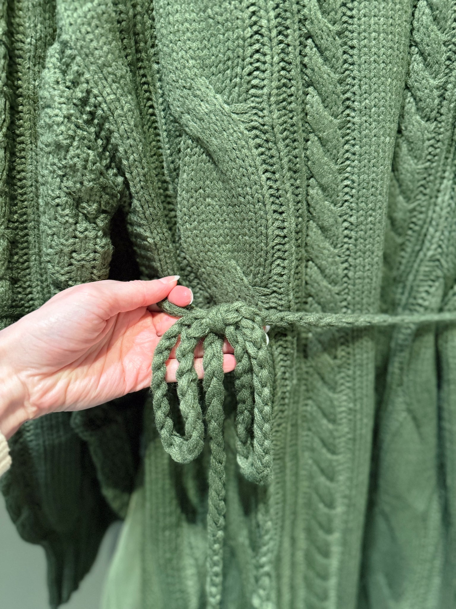 Soft knit meets delicate tulle skirt in this cozy sage dress. Features a high neckline, textured cable knit, and a flattering tie waist.