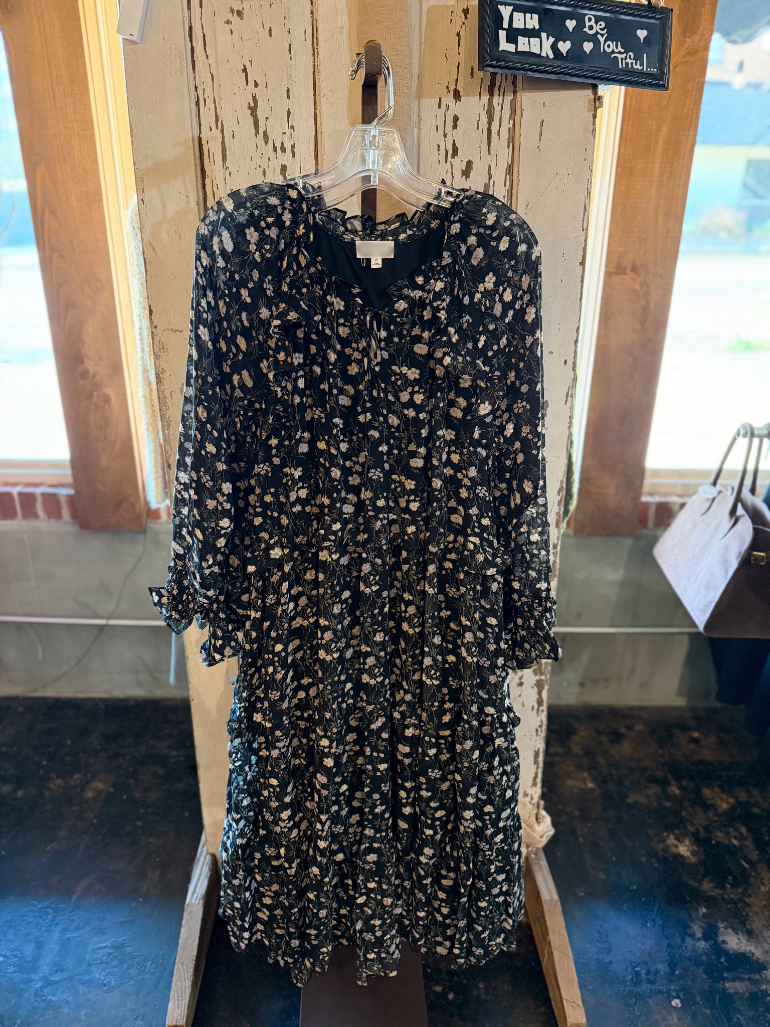 Tiered ruffle trim midi dress + round neck with ruffle + tie detail + a line cut long sleeves with shirred elastic cuffs + lined