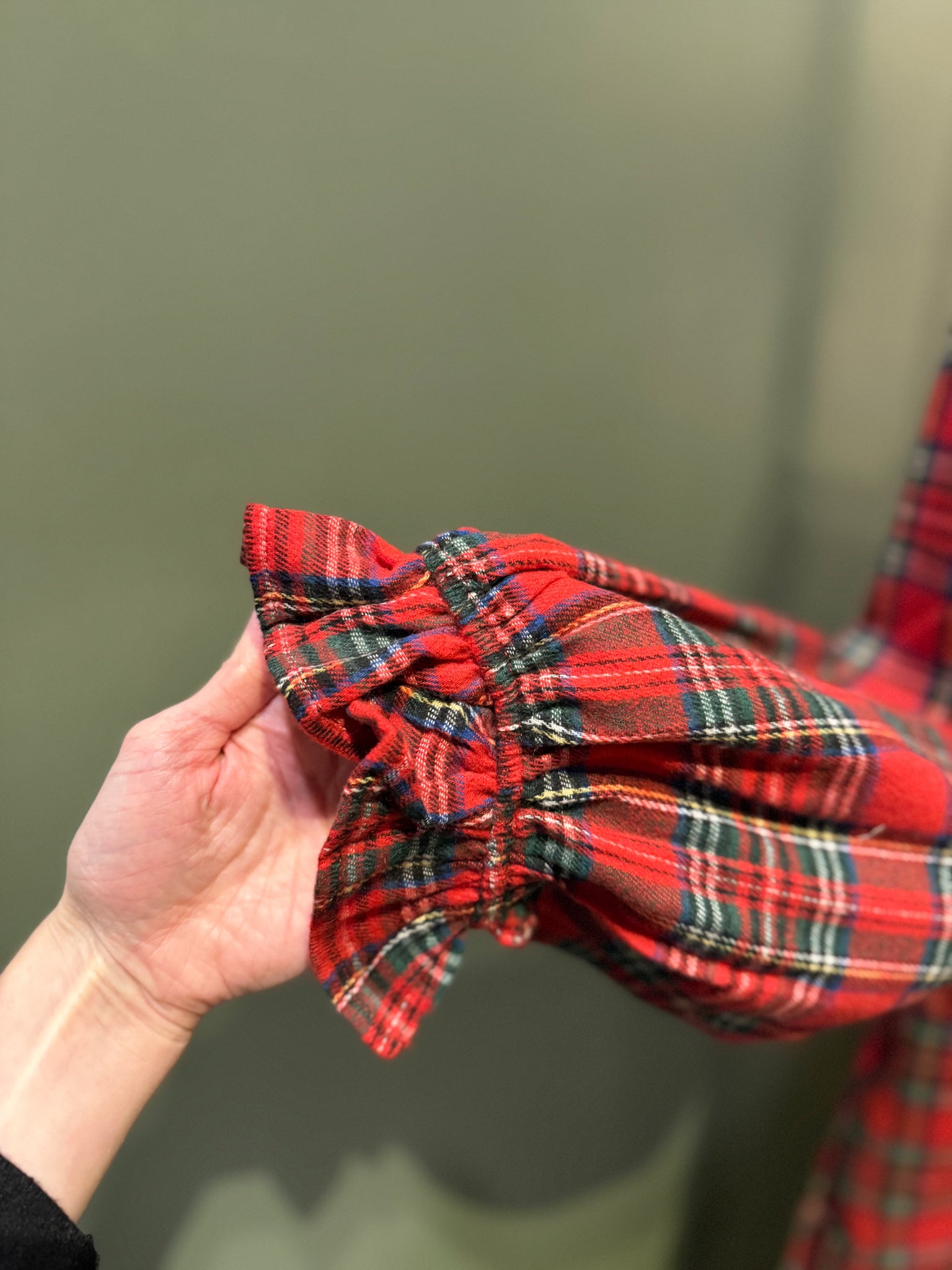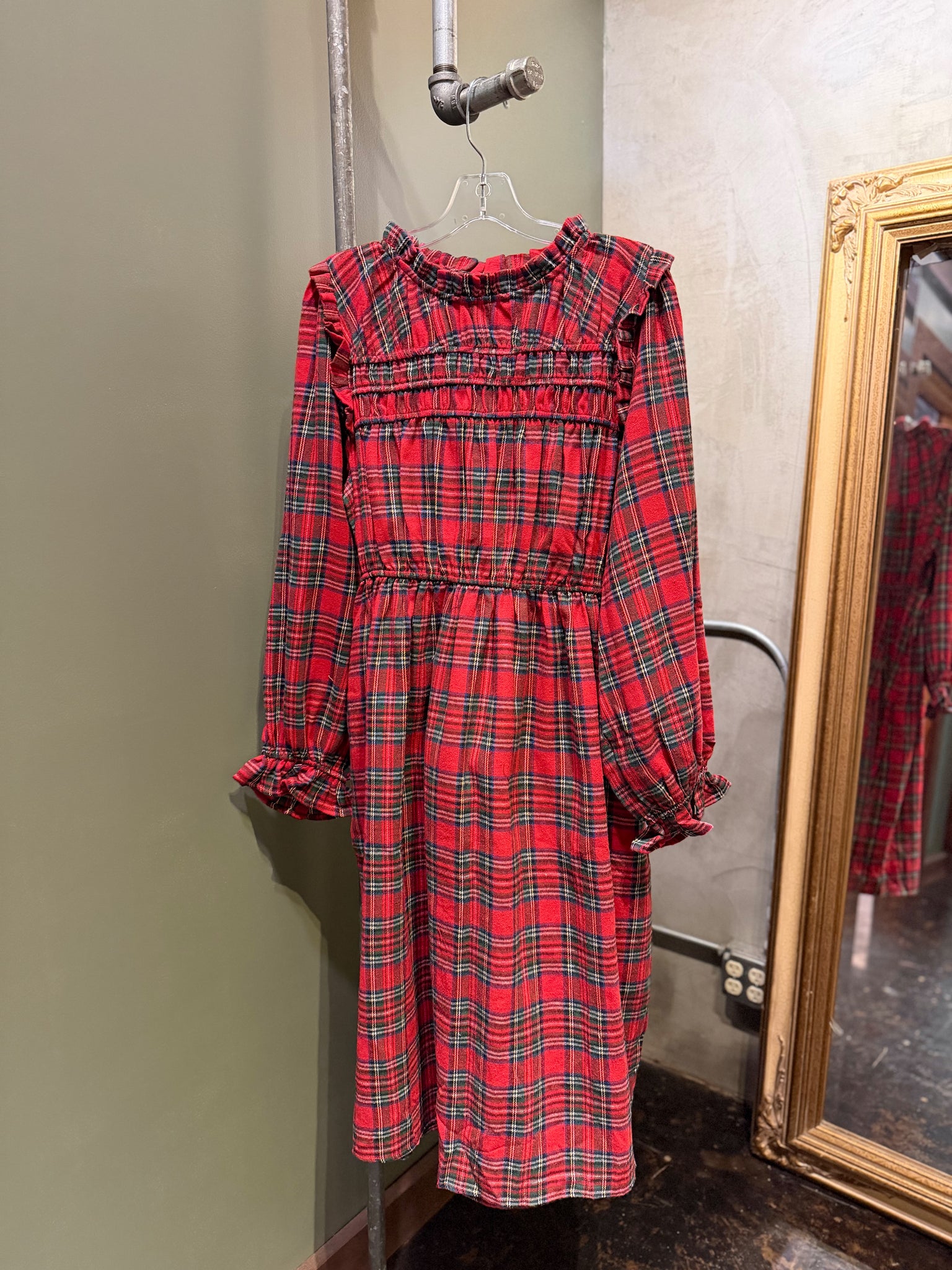 Frilled mock neck elastic ruffle long sleeve elastic waist midi length plaid