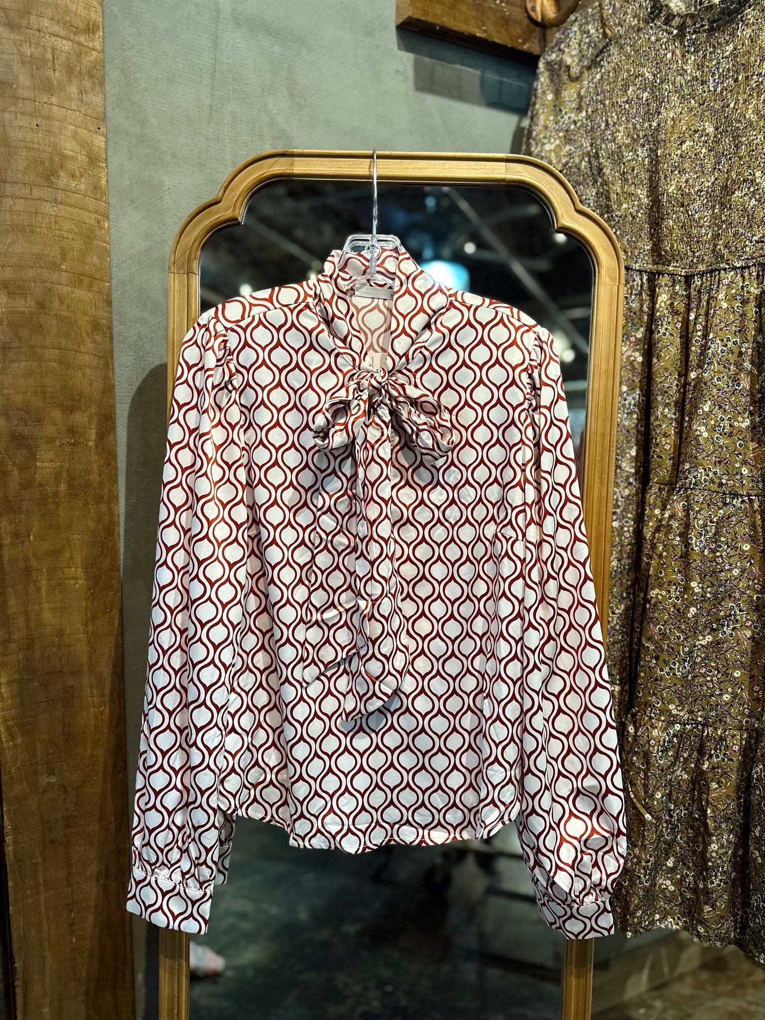 Long sleeve neck tie satin print top
